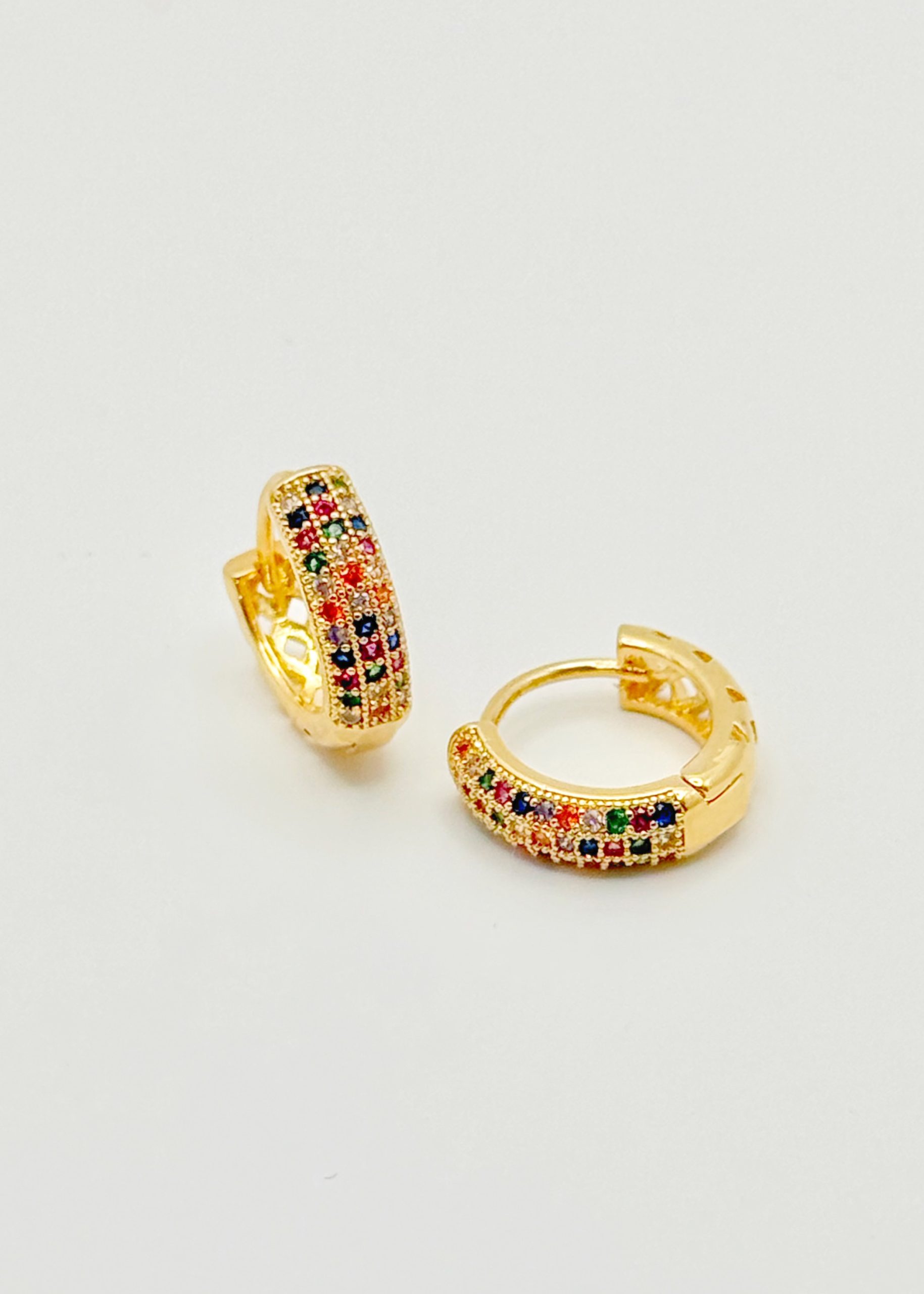 Pendientes chapados en oro de 22 quilates con una base de materiales nobles e hipoalergénicos. En forma de aros pequeños con 3 líneas de circonitas de colores .